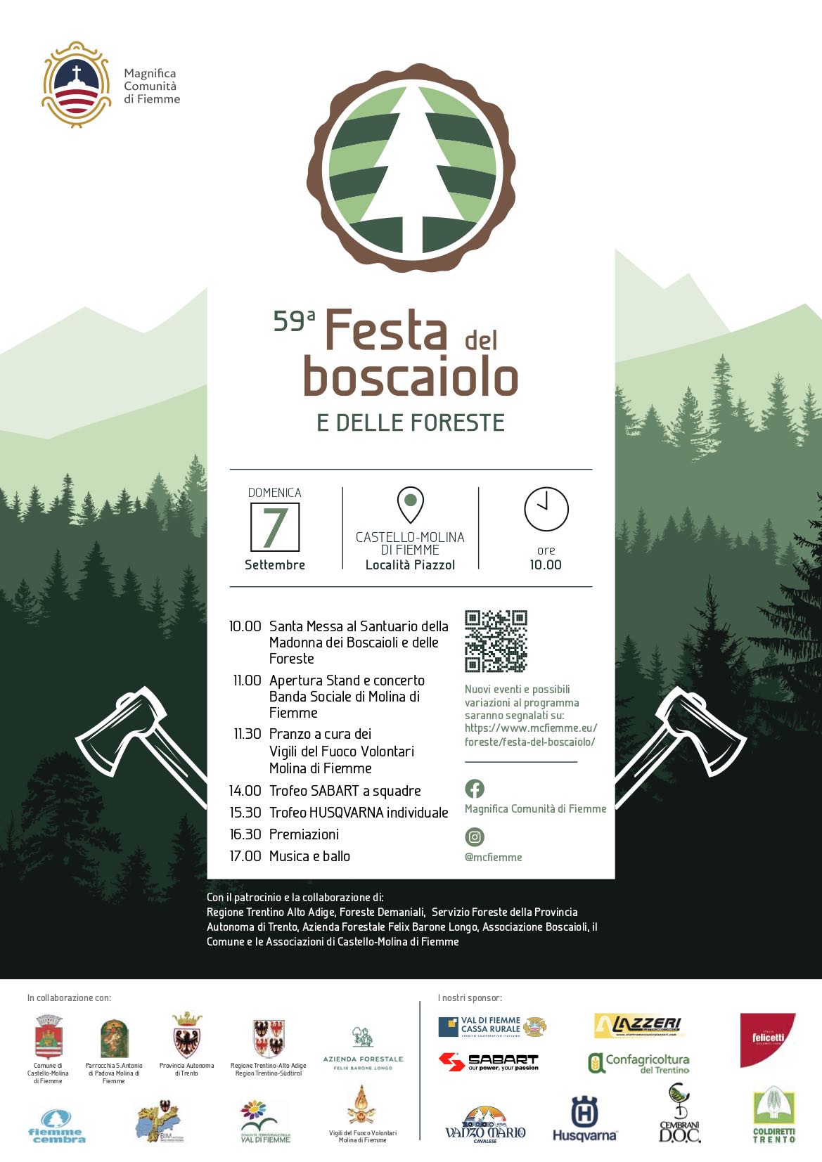 Come avviene da quasi cinquant’anni, la Festa del Boscaiolo e delle Foreste è ancor oggi programmata grazie all’impegno organizzativo e finanziario della Magnifica Comunità di Fiemme, del Comune di Castello-Molina, dall’Azienda Forestale della Magnifica Baron Longo, dalla Provincia Autonoma di Trento (l’Agenzia Provinciale delle Foreste Demaniali), della Parrocchia Sant’Antonio di Molina.